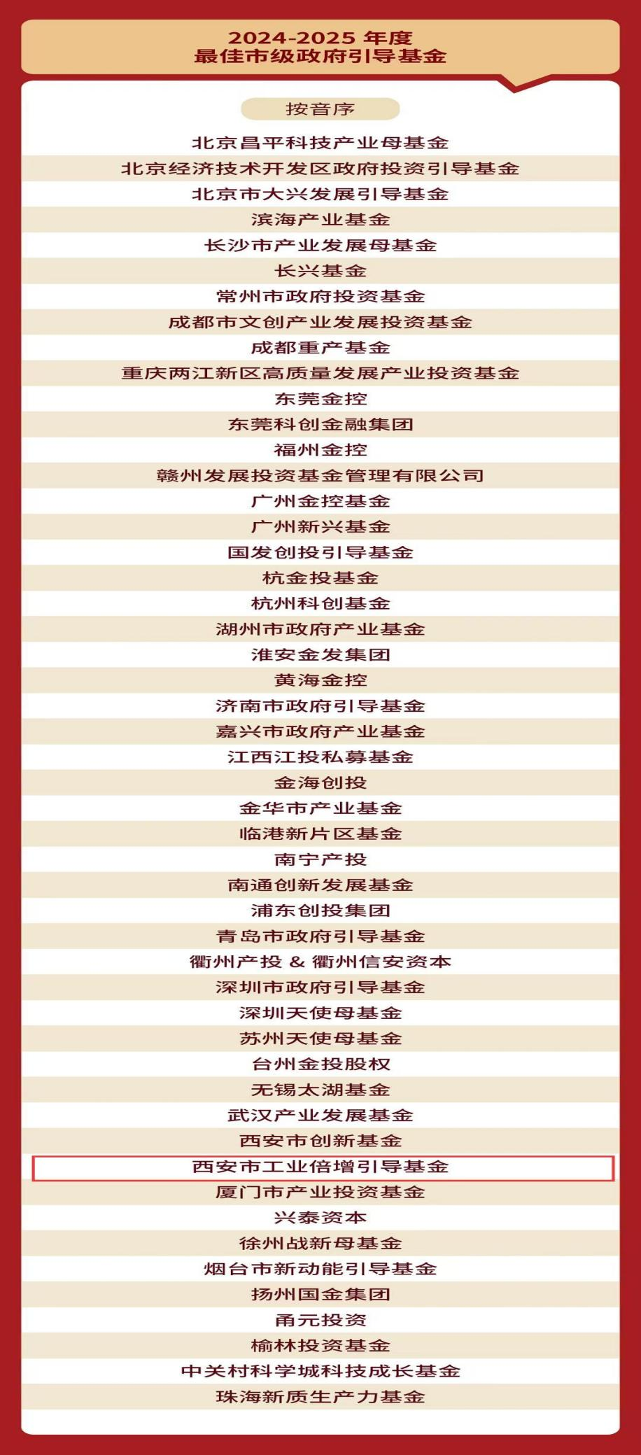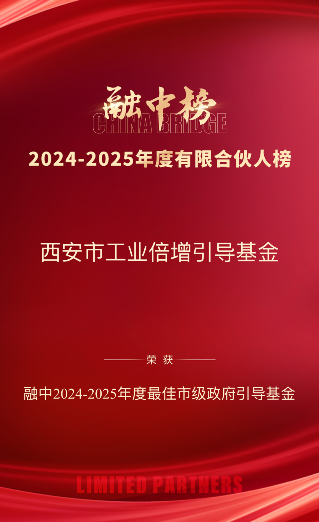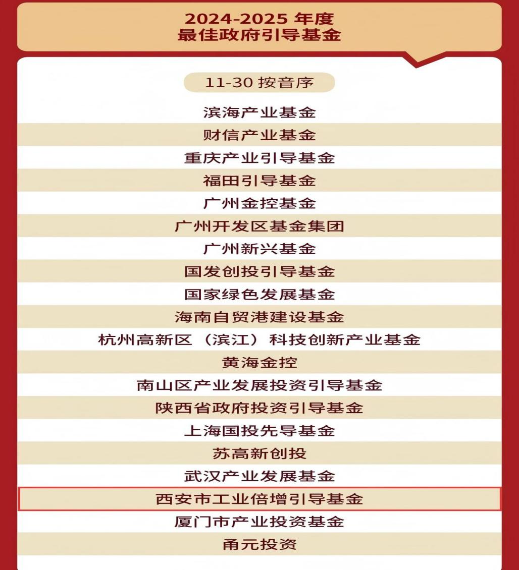 2025年7月23日,融中發(fā)布2024-2025年度有限合伙人榜單。由西安投資控股負(fù)責(zé)市場(chǎng)化運(yùn)作的西安市工業(yè)倍增引導(dǎo)基金榮獲“2024-2025年度最佳政府引導(dǎo)基金”“2024-2025年度最佳市級(jí)政府引導(dǎo)基金”。這是繼獲得清科“2025年中國(guó)政府引導(dǎo)基金50”“2025年中國(guó)地市級(jí)政府引導(dǎo)基金30強(qiáng)”榜單后,西安市工業(yè)倍增引導(dǎo)基金今年斬獲的又一行業(yè)權(quán)威榮譽(yù)。